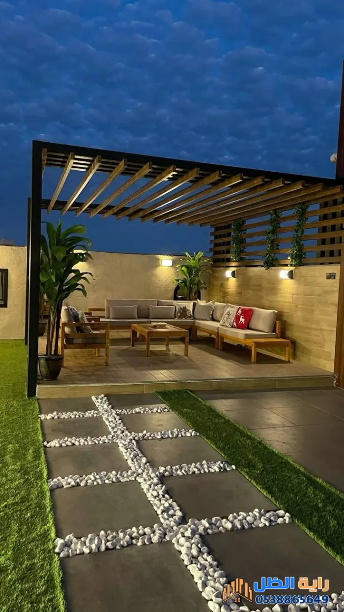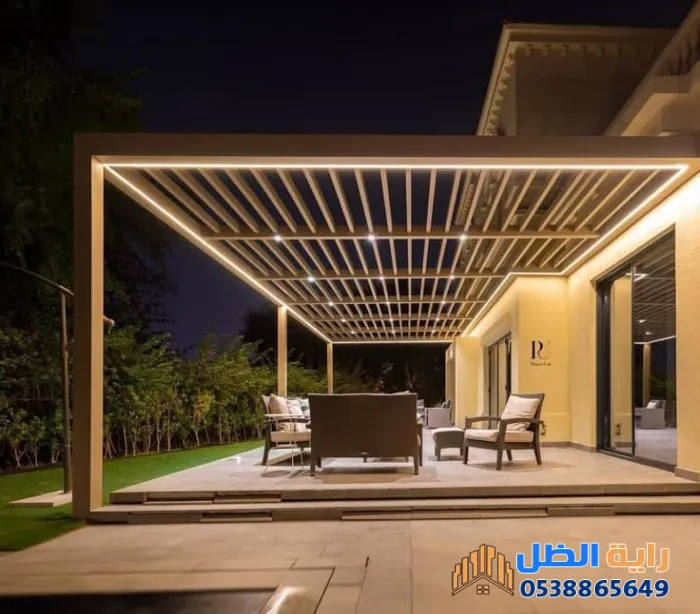 - الإضاءة المخفية: استخدام شرائط LED في زوايا البرجولا يمنح المكان هدوءاً وجمالية في المساء.