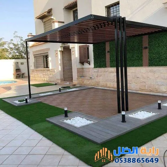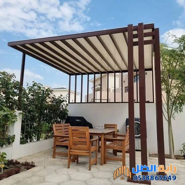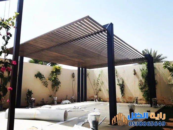 تستخدم في الحدائق والأسطح لخلق فضاء مريح للعائلة. يتم دمج الحديد مع اللكسان (الزجاج الشفاف) أو القماش ليعطي مظهراً عصرياً.3. مظلات المدارس والمشاريع